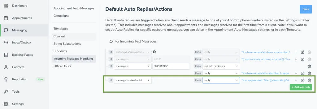 For more advanced use cases, you can combine this with other auto reply rules under the “Incoming Message Handling” section.